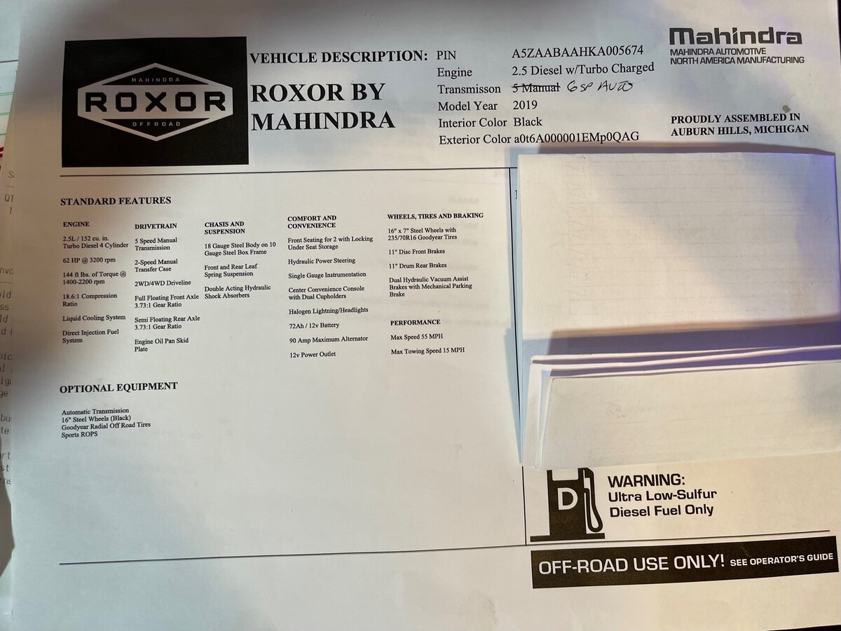 2019 Roxor by Mahindra Side by Side for sale. Only 899 Miles! Practically brand new, just don't use enough to justify keeping. Automatic transmission. Options and accessories installed include stage 2 tuner 110HP, intake tie-down, 9,000lb winch, heater and defroster, windshield wiper and washer, overhead 2 gun rack, turn signals, Couragia Tires M/T LT 31/10.50R-15, Black Steel Wheels, Lock-Out Hubs, 2" receiver hitch, 50" Kill Light Predator Blackout LED light bar. $27,000.00