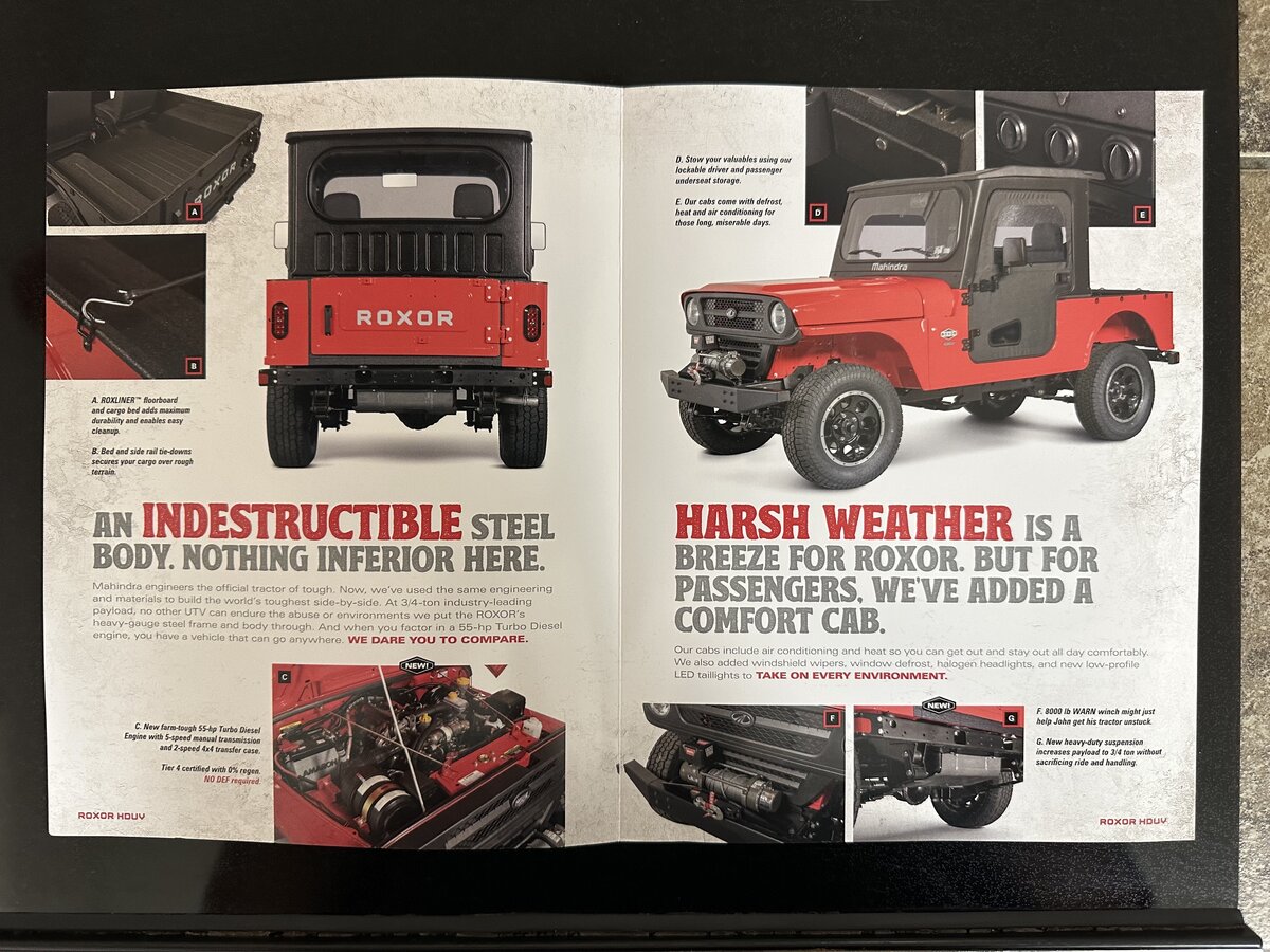 Attached are some pictures of the brochure I picked up today. I generally like the new model but the front definitely needs some attention. Another thing I did not like was the huge ROXOR lettering on the tailgate. Fortunately, I confirmed that they are stick on tape, so I can just peel them off if I get one. I liked the look of the flush mount LED tail lights, but I still dont know how they are wired or how we could wire in a turn signal option.