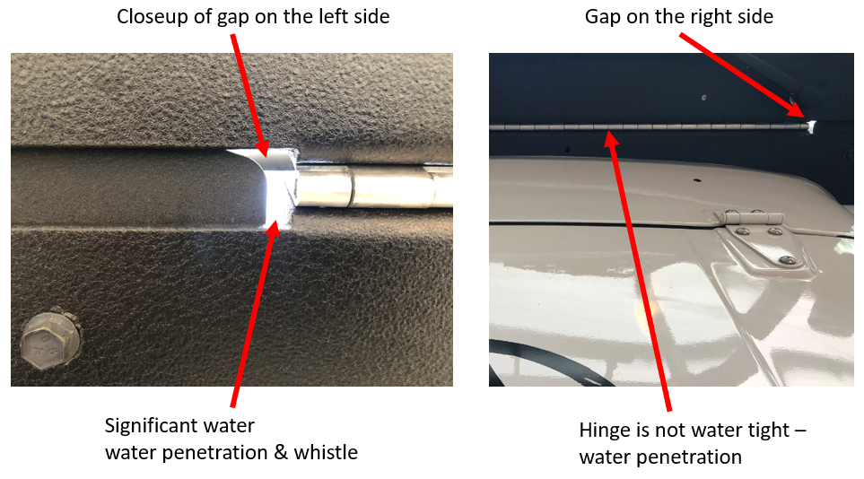 Yes, there is a at least 1” by 1 1/2” gap between folding windshield hinge and the OEM structural frame. This causes significant water penetration and an irritating whistle. The hinges are also not the kind that are water “proof” (sealed), so if you drizzle water over it, it seeps through to the cabin and if by chance you drive in the rain, you will have water penetration as it happens with me.