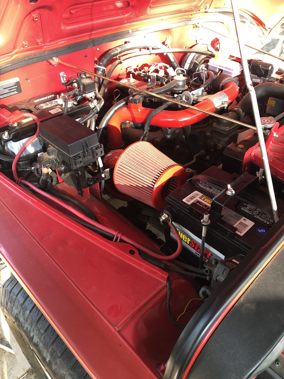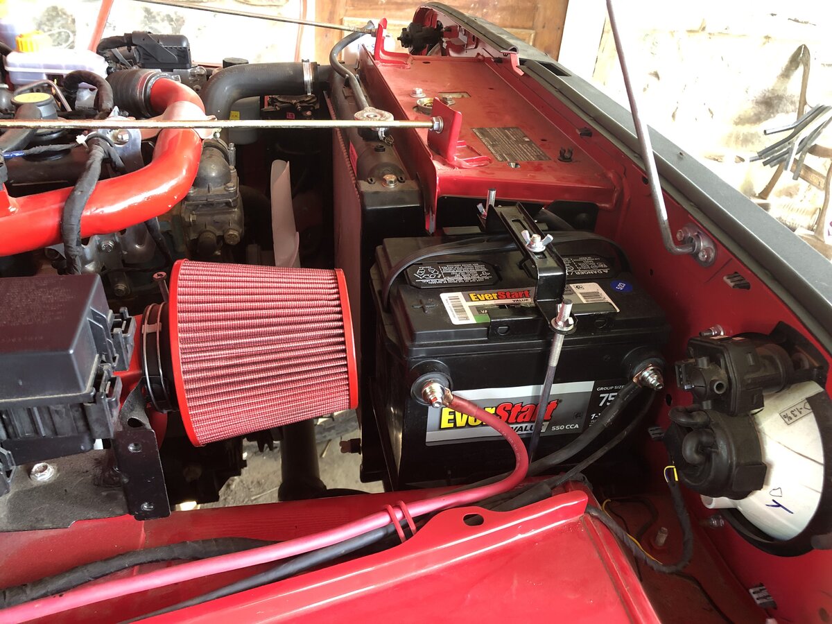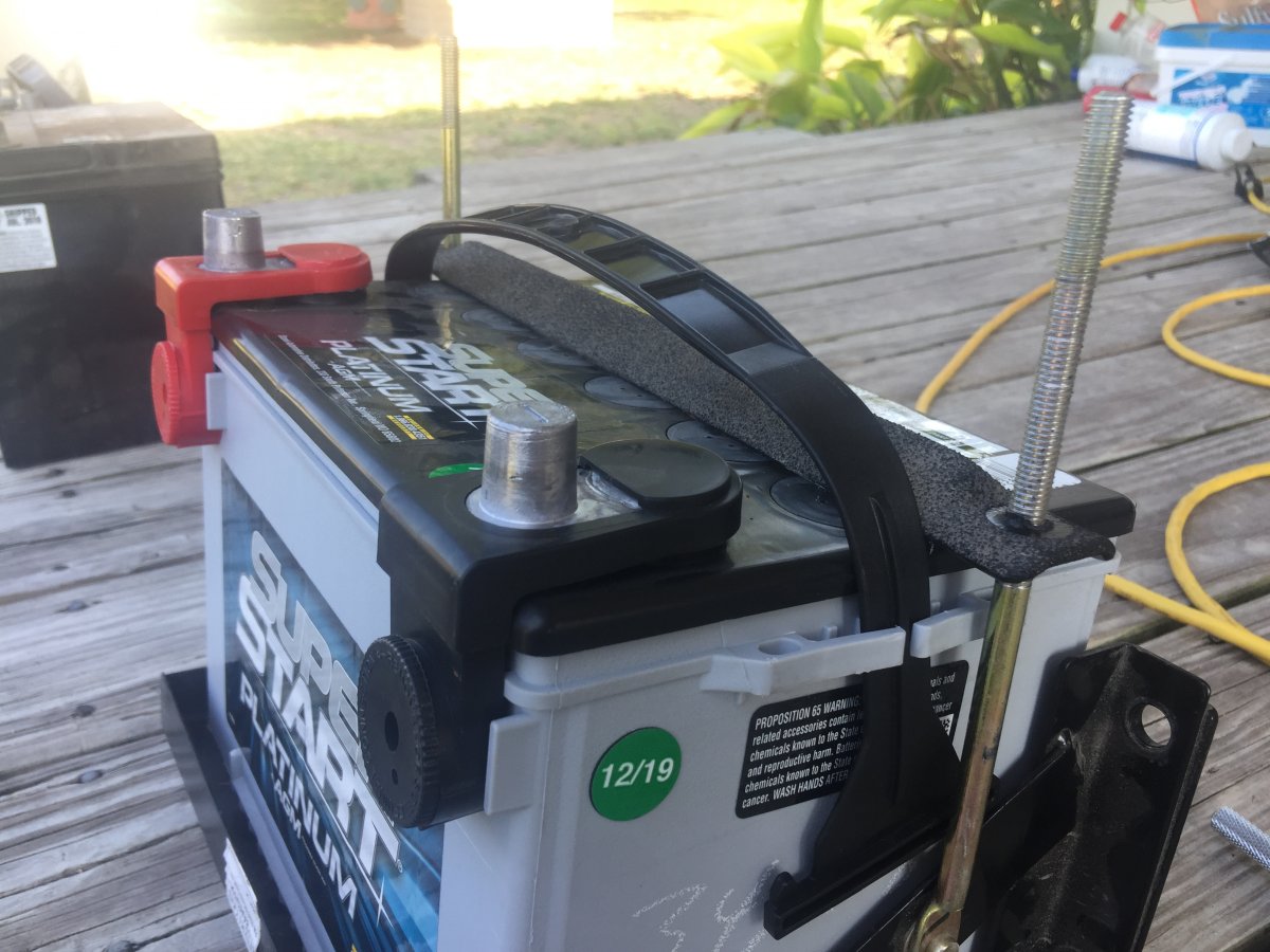 The 34/78 is almost a direct swap. It fits the tray just fine but the hold downs must be modified. I was hoping the stock hold downs could be removed easily for new ones to be fabbed up. That was not the case. The hold down bolts are riveted onto the tray and must be ground off. Being that I was limited to tools at the house i decided not to grind them off and spend time going back into town looking for new tie down bolts or trying to modify these to be shorter. I had hoped that they were clipped on and could be moved down into the hole below the stock placement. I didn’t discover this until I had the battery tray removed. Removal was 4 bolts on the firewall and one under the tray.