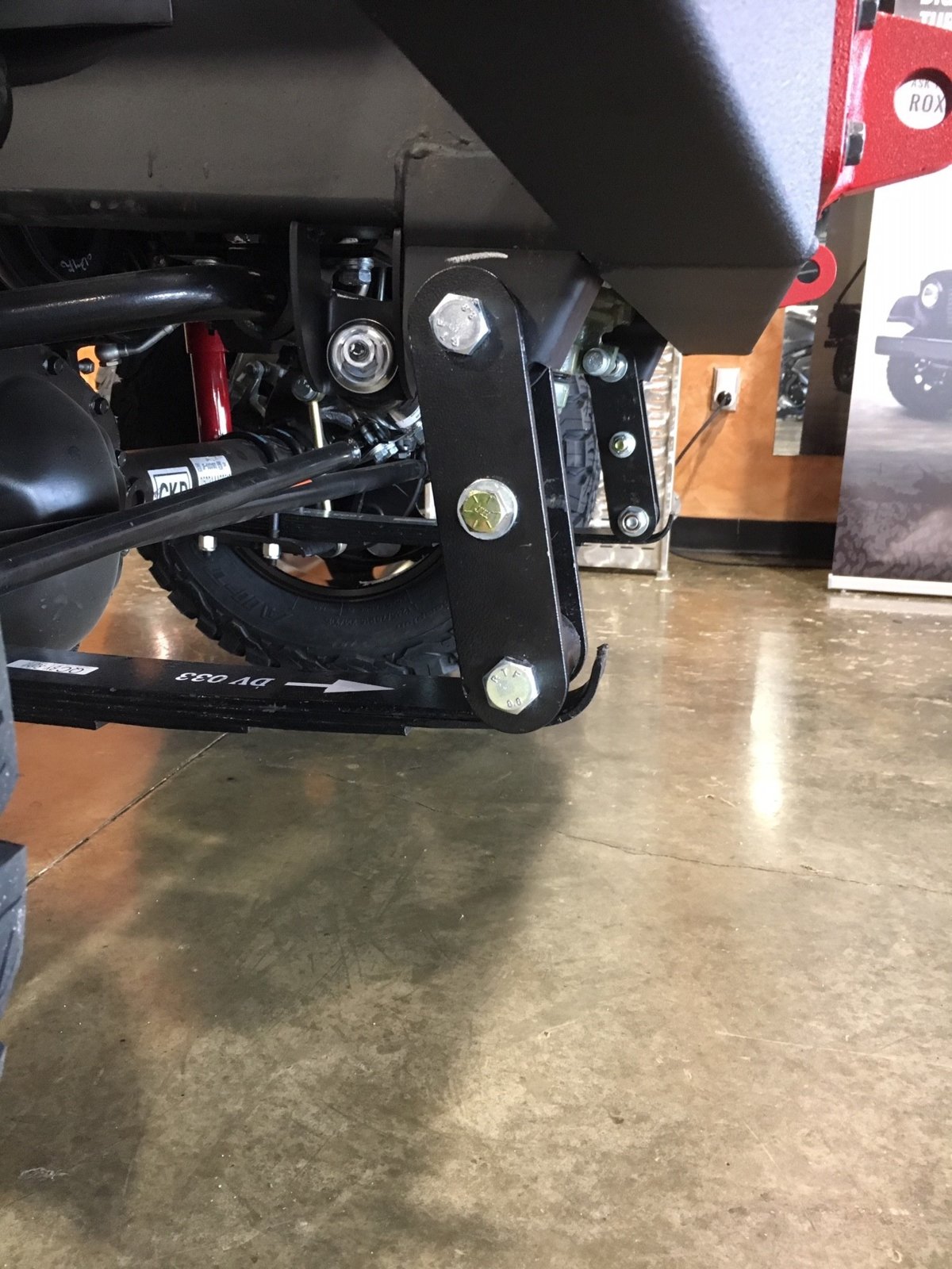 For the lift (level only in the front), he bought CJ shackles off Amazon (link: https://www.amazon.com/Rough-Country-RC0283-1-25-1-75-inch-Scrambler/dp/B00B2AFKKM/?tag=roxor-20). He did say he had to bore our the holes a bit to fit the Roxor leaf spring bolts.