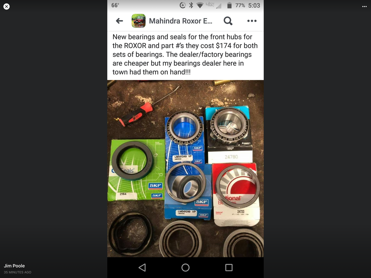 We are just finishing up replacing all the Bearings and Seals in my Rear End. The parts came from Jesse at Torq King 4X4. Timken Bearings are going back in. My mechanic was not impressed with the Mahindra Bearings. It is good to have a source of bearings that are better than the OEM parts.