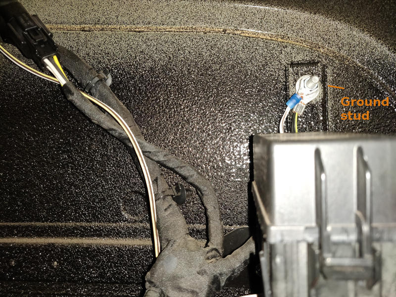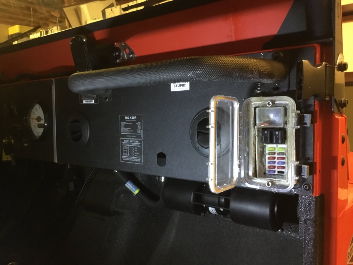 The wiring is routed over to the fuse box under the right side of the dash. I connected the positive wire to fuse F28. This fuse appears to be unused on my Roxor and is a 10 amp fuse. Power to this fuse shuts off with the key which is perfect. There are two factory wires going to this fuse. You want to splice into the wire that is closest to the outer part of the fuse box. For the ground wire, I connected it to an existing ground stud above the fuse box. You will have to add a nut to the stud.