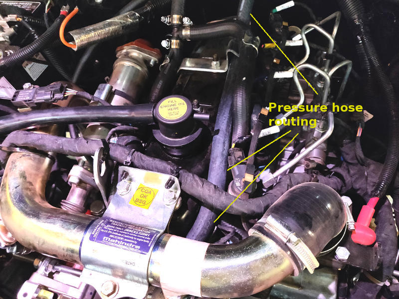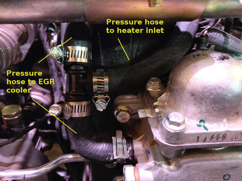 Under the hood, there are a couple of different ways to run the hoses and it all depends on the type of heater you use. Mine has a shut off valve on it. Some heaters do not have a shut off valve. For my heater with the shut off valve, the hoses can only be routed one way, in parallel with the hoses that run to the EGR cooler. For heaters without a shut off valve, the hoses can be run just like I did, or they can be run in series with the EGR cooler hoses. In series means a hose runs from the engine to the EGR cooler, then from the outlet of the cooler to the inlet of the heater, and then from the outlet of the heater back to the engine. In parallel mode like my setup, we have to tap into the two EGR cooler hoses with T-fittings. If we use the "series" mode, closing the valve on the heater will shut off the coolant flow through the EGR cooler and that is not a good thing.