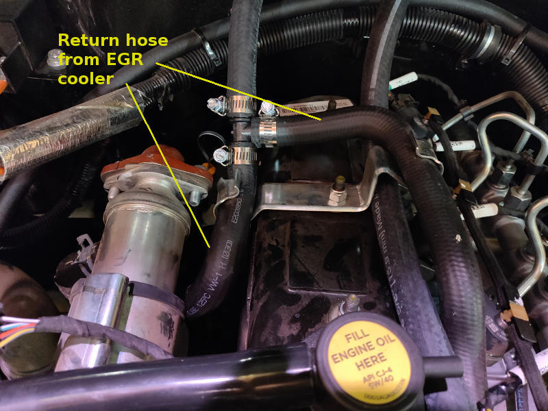 This photo shows how I tapped into the return hose from the EGR cooler. I cut the hose right where it makes a 90 degree bend and added the T-fitting there.