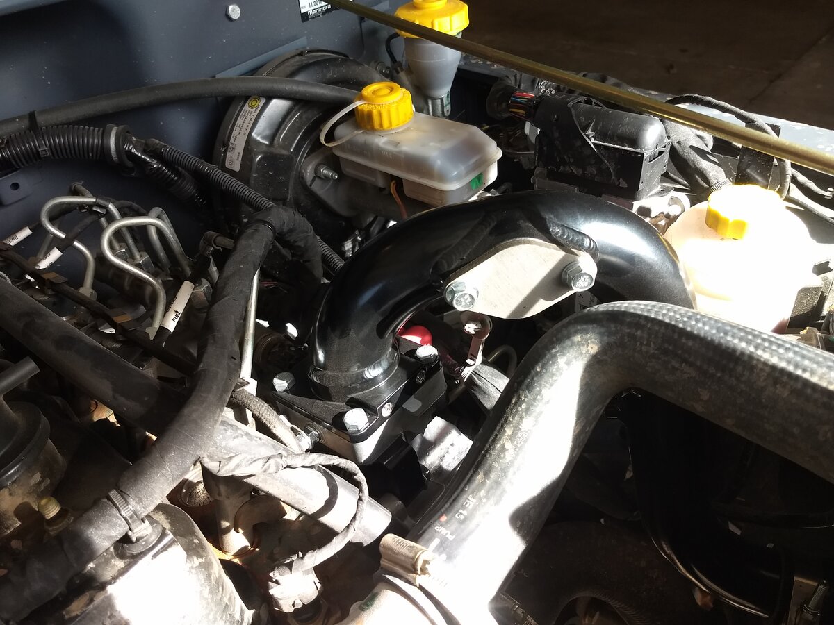 One thing I want to do now is add the factory accessory fan shroud to help the fan pull more cool air across the intercooler at low speeds for trail riding. Plus install a pyro in my manifold EGR block off plate and a boost gauge in one of the 1/8 ports on the cold side intake tubing.