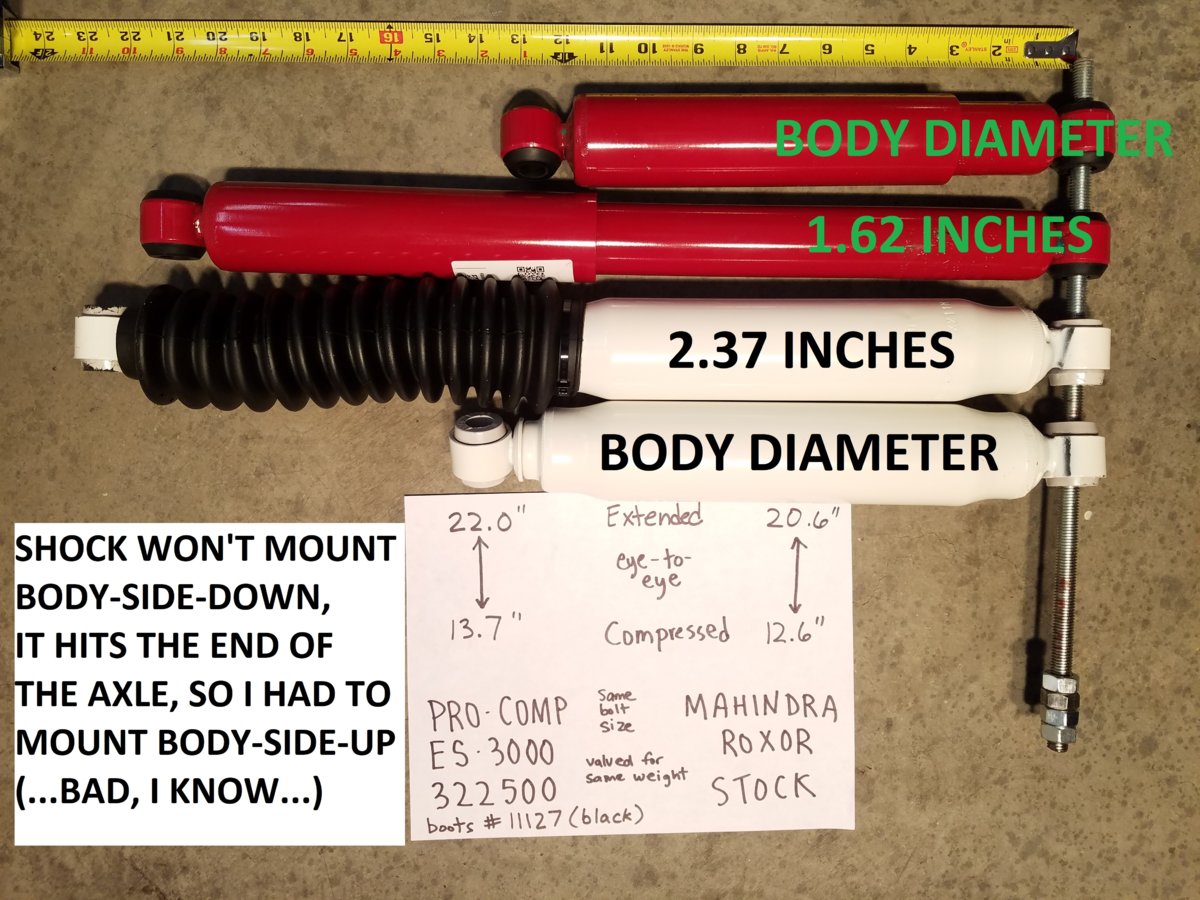 Yes, we all know that twin-tube shocks including this one are valved and lubricated for the body of the shock to be down and the piston to project upward, but the much larger diameter of the Pro Comp shock body compared to the Mahindra doesn't allow proper mounting orientation, because the shock body hits the end of the axle (right before the knuckle), and there's no easy way to modify it to fit. If you were motivated, you could make a new plate to hold the bottom shock mount (and hold the bolts below the leaf spring), making it any distance you like from the axle, thereby allowing correct orientation. There are a ton of shocks out there, but most thin-body designs will be much more expensive, monotube, remote reservoir, or valved for much heavier vehicles. If anyone finds a shock which is slightly longer than stock/OEM, please let us know!