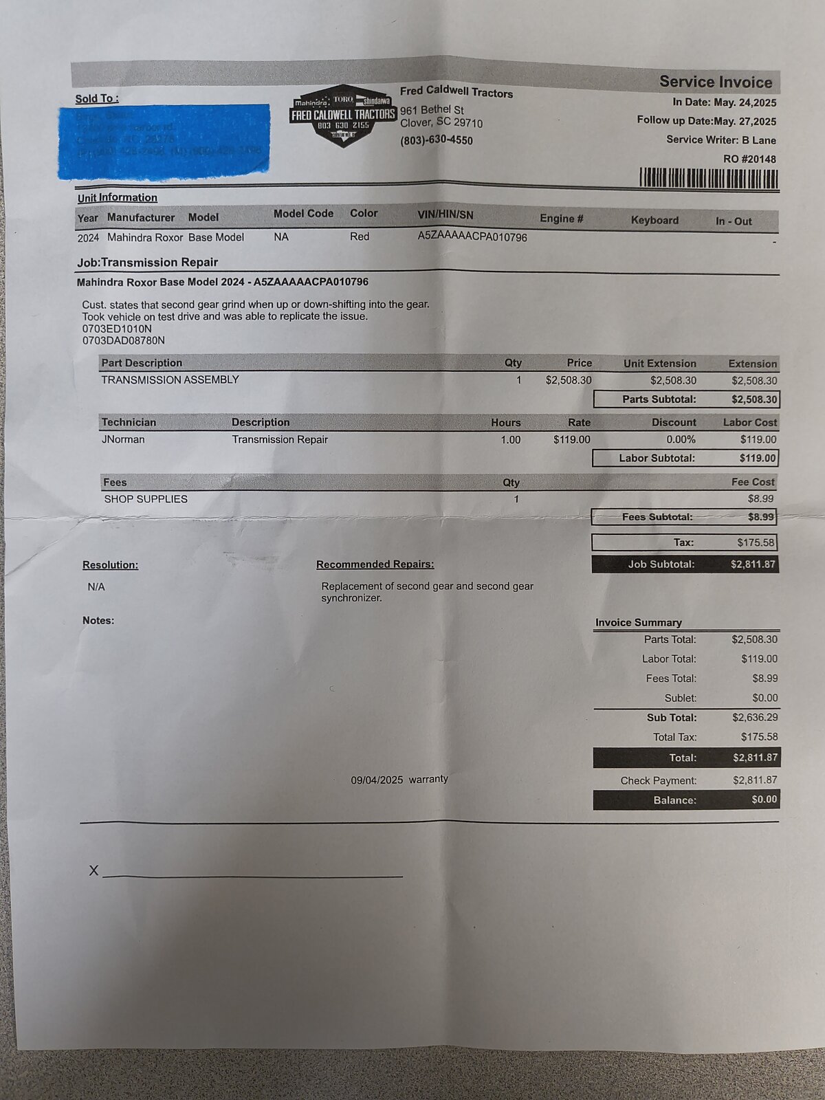 ONE HUNDRED AND THREE DAYS. That's how long that it took to complete. I am unable to explain why but the experience cannot be described as reasonable. The transmission is functioning correctly and I am glad to have my machine back. No explanation offered. Just a surly "sign here, the machine is out to the side".
