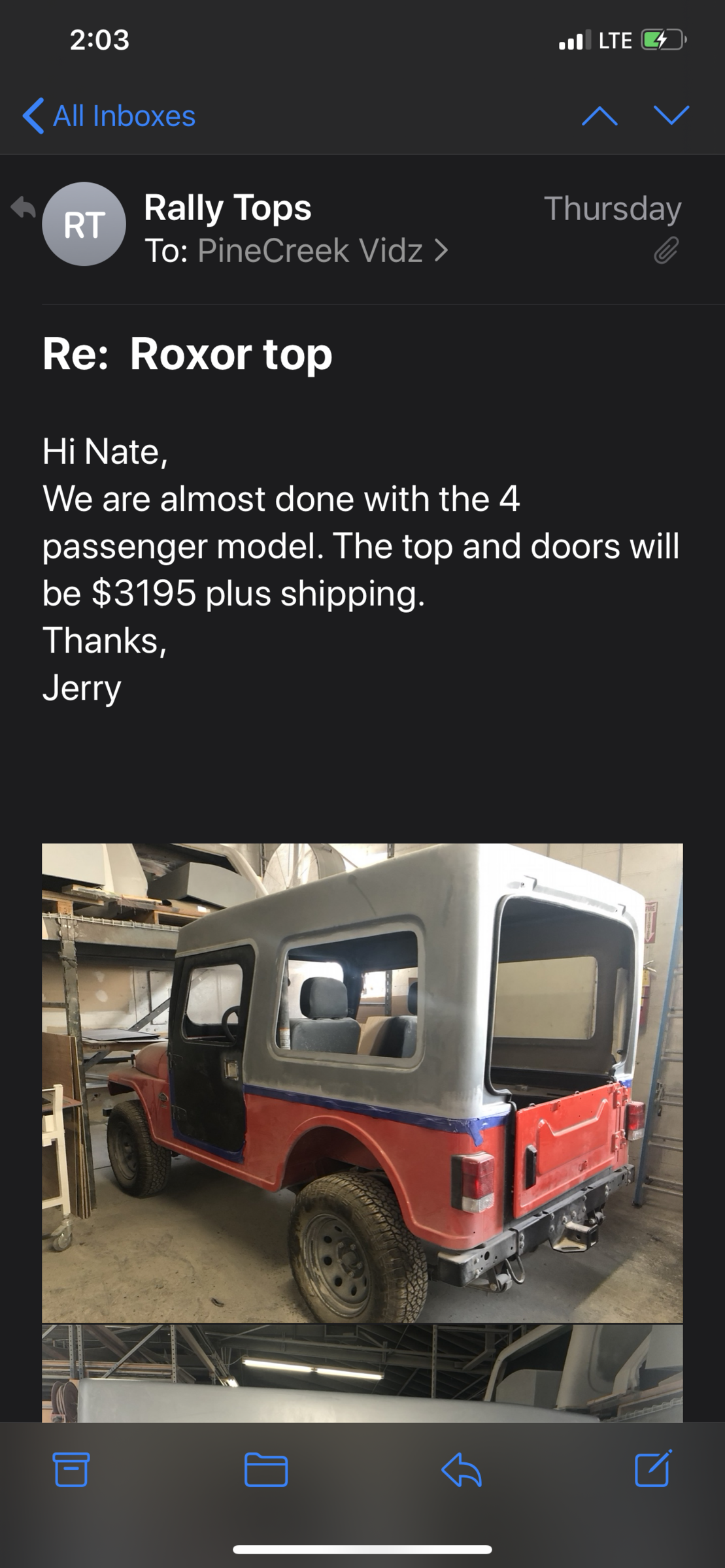 Good to hear.... Jerry was putting me together on itI was quoted $2995 too. They said this would be for the 2 doors and top.