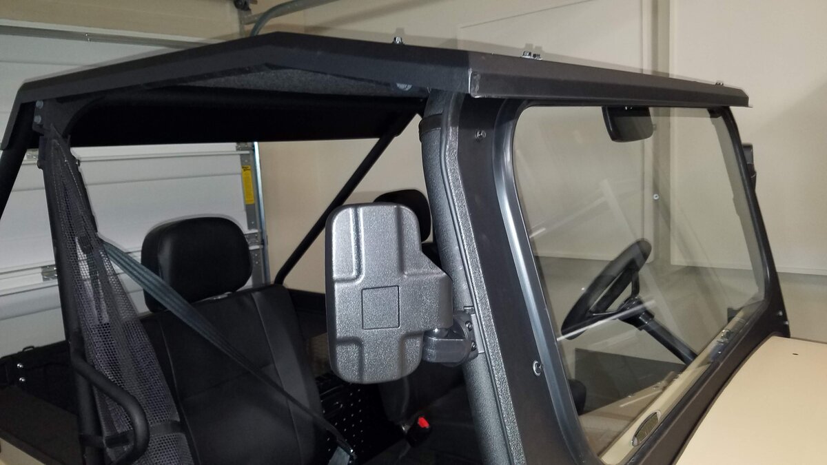 This is my first update on the progress of my conversion of my basic Roxor into the patriot Roxor that I`ll affectionately call Liberty. Today's accomplishment was removing all the "stickers" and logo`s to prep for her new flag theme. I did leave one sticker inside at my husband's request (see photo) in case he drives it! Also added mirrors, rack for a spare, flipped the tires to white letters out, and installed a lighted license plate frame. New grill and horn are up next! Liberty is pictued with her sibling, my husband's Roxor!