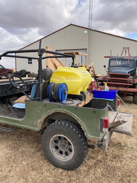 This is my set up for my Roxor when using it as a spray rig. I now have a 3/16" rino lined sheet metal plate to bridge the area across the fenders in the bed to make a flat platform. I leave the flat plate across the fenders in most of the time. Works great for feed sacks and deer corn.
