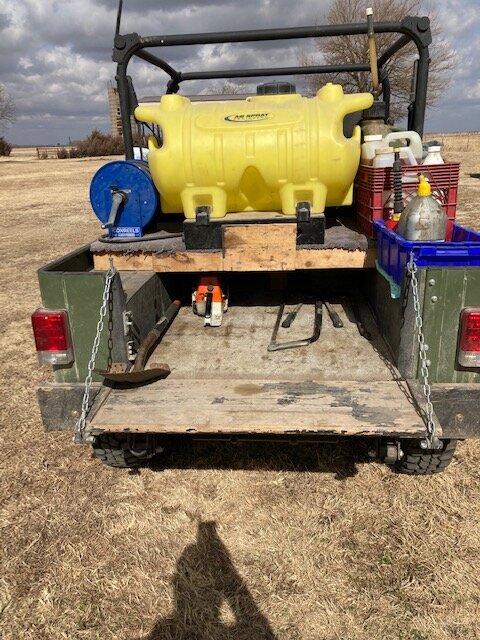 Thanks for the pix. Looks very good. Here's my latest arrangement. Got the chainsaw underneath the sprayer, and a hose reel for the hose. A little box on the wheel well for chainsaw gas, etc. Finally, put a little box between seats so that I can carry 3 people up front, if they're friendly. Don't know how much more I can squeeze in here, but it sure has been fun.