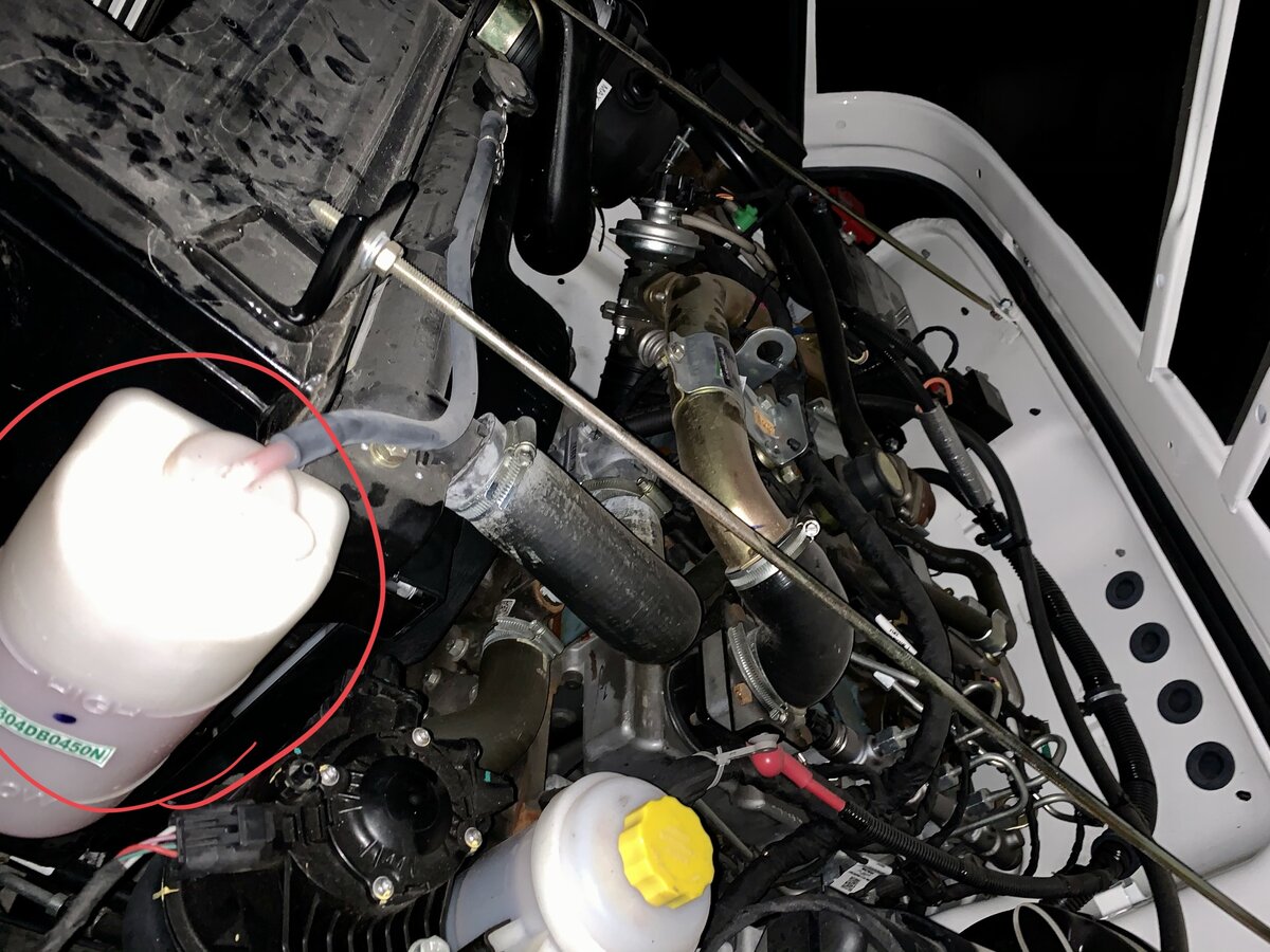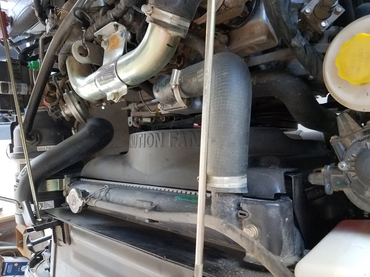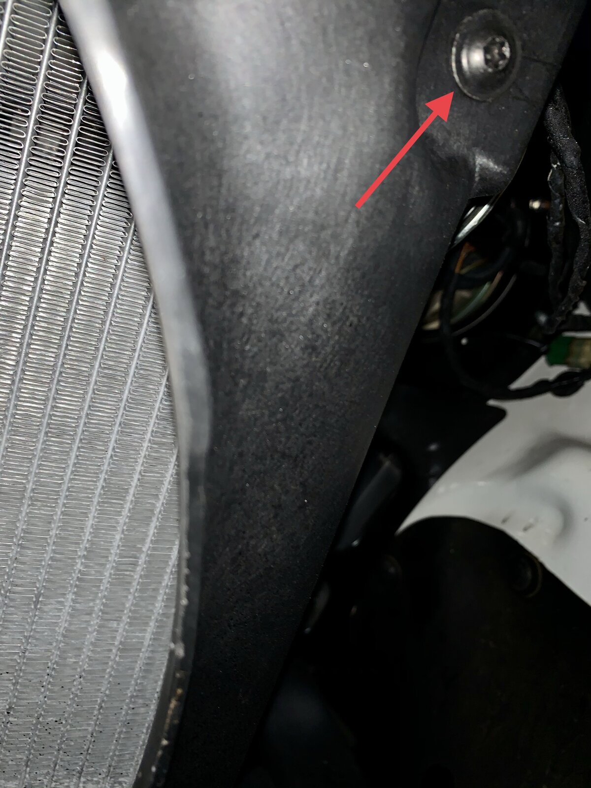 Hope it helps, remove the two items circled in red makes it easier, the air intake out of the way makes it best to slide in the shroud. I did not disconnect the coolant hose!