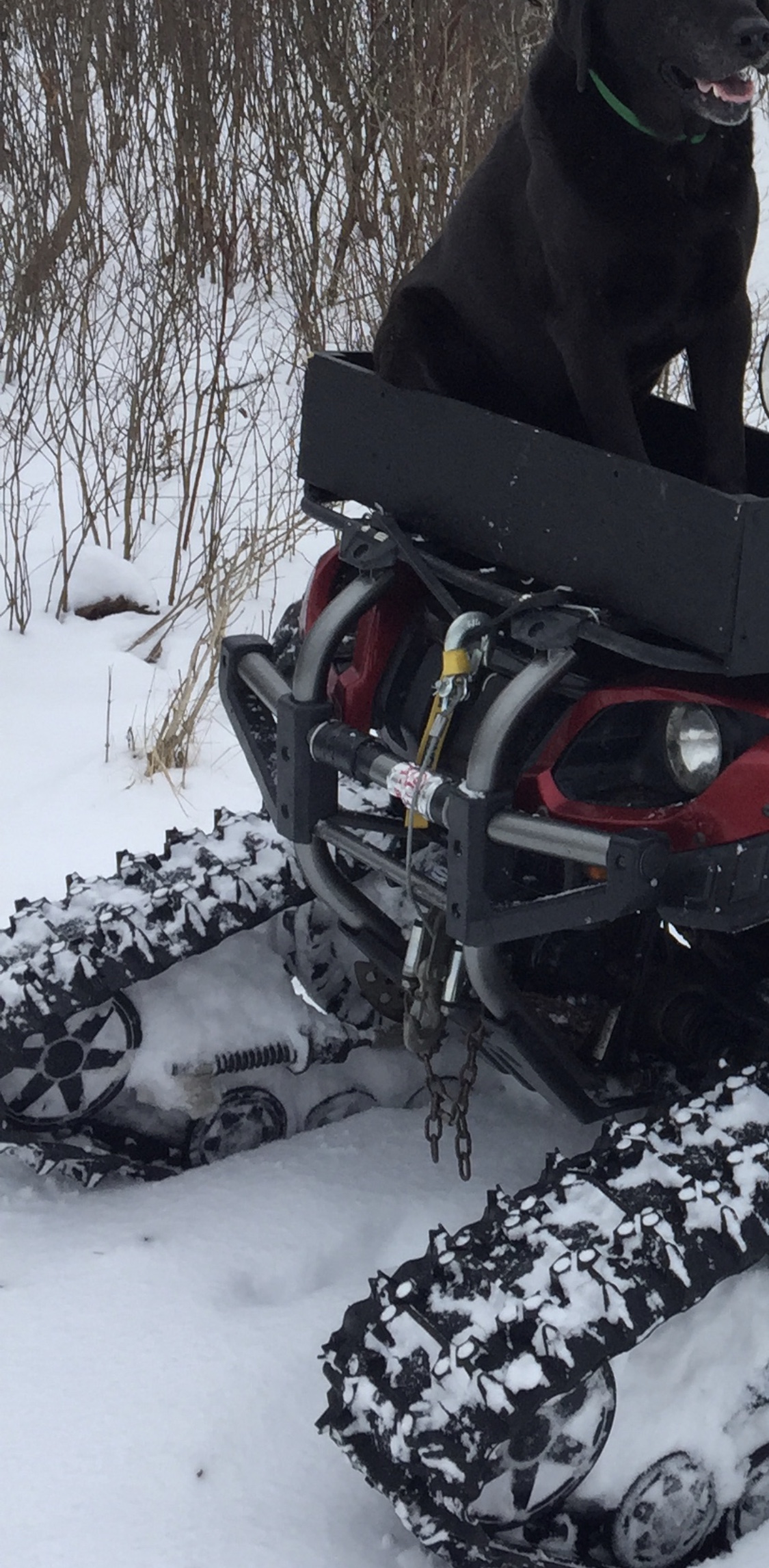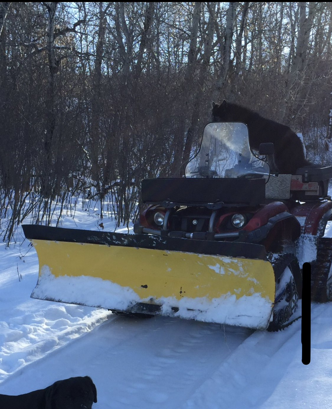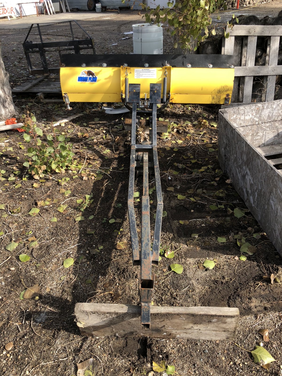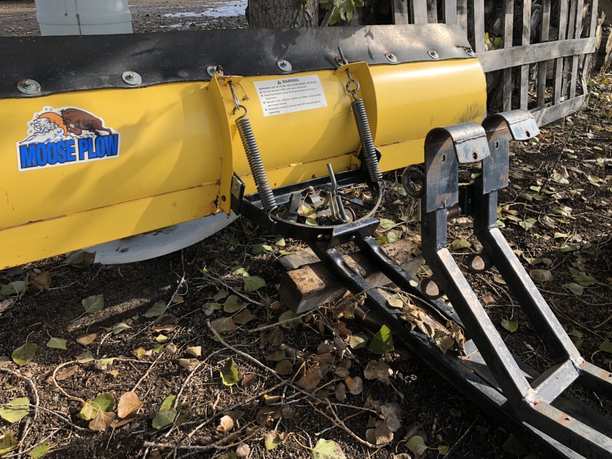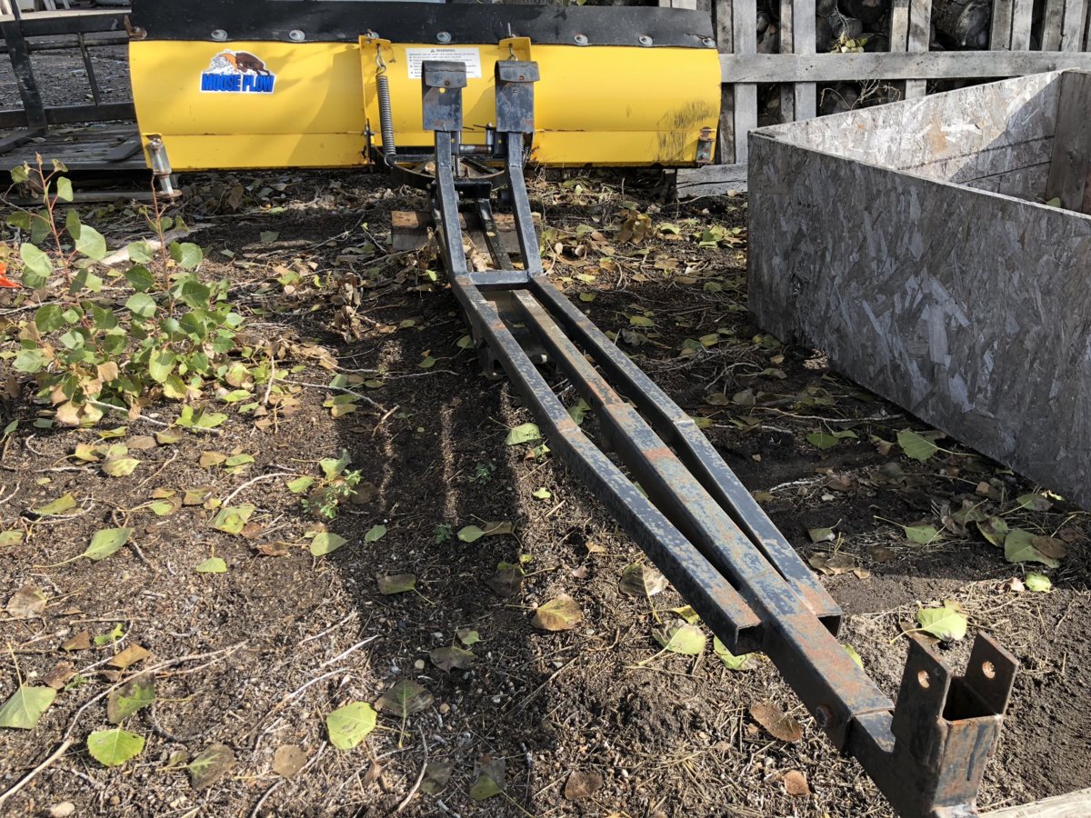 This is the 72" plow that I use on my Grizzly with tracks, my brother made it quick mount to fit 4 different units, so now it will be 5 units. The whole frame that mounts under the unit is homemade and comes off with the plow. The only thing that stays on your push unit is the 2" front mount to hang the plow on, which could be removed if you wanted when the plow is not needed. Originally it came with the light plate to mount it to the frame of a Rhino. You just need a 2" pipe the right height for the front and extend the push tube to the rear hitch and slip in a pin. I'll have to extend the tube for the Roxor. You drive up to it, lift the front on to the mount bar, hook up the winch and lift and it lifts the rear mount into place, pin it and go. On the Grizzly, the mount is the front bumper. If the snow gets too much for this, then we pull out the big guns, my "little" tractor with blower, snow push bucket and tire chains. The plow is mainly for the road to the cabin. Tractor is used around the house and shop in town.