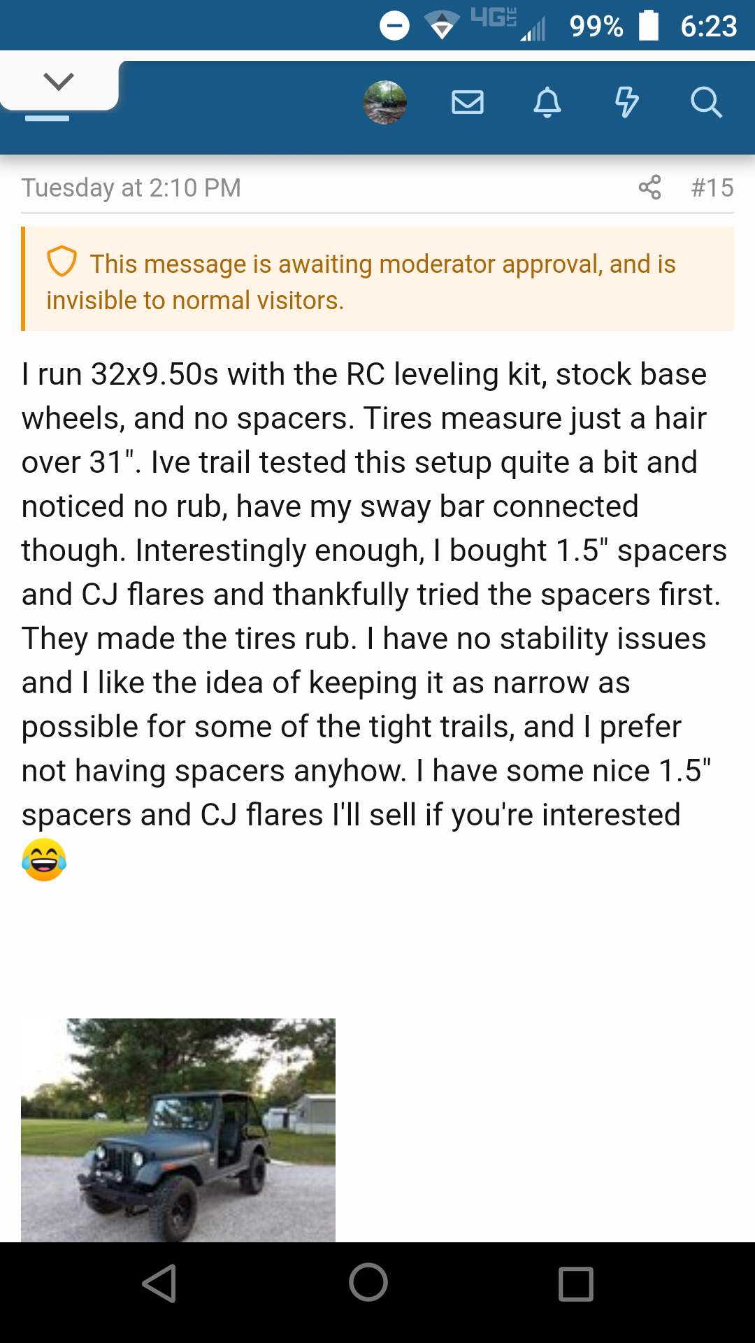 I run 32x9.50s with the RC leveling kit, stock base wheels, and no spacers. Tires measure just a hair over 31". Ive trail tested this setup quite a bit and noticed no rub, have my sway bar connected though. Interestingly enough, I bought 1.5" spacers and CJ flares and thankfully tried the spacers first. They made the tires rub. I have no stability issues and I like the idea of keeping it as narrow as possible for some of the tight trails, and I prefer not having spacers anyhow. I have some nice 1.5" spacers and CJ flares I'll sell if you're interested ?